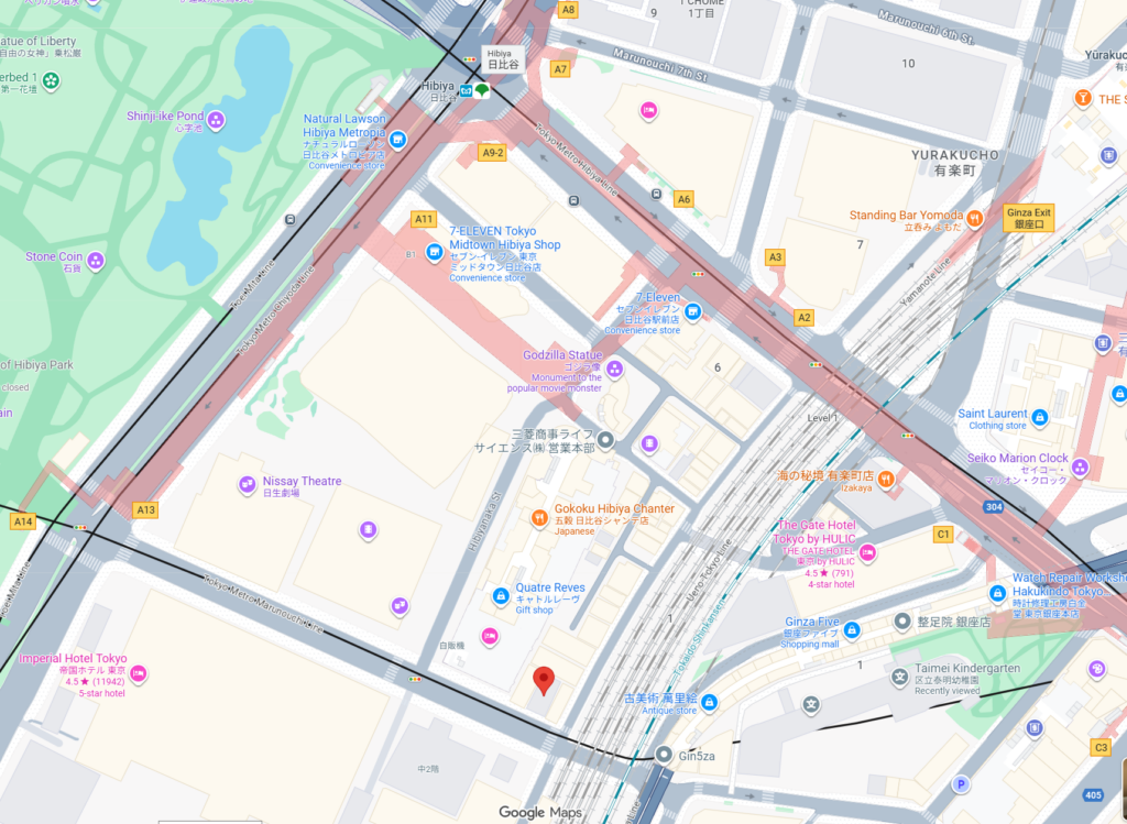 Subway Chiyoda Line: Hibiya Station, Exit A11.